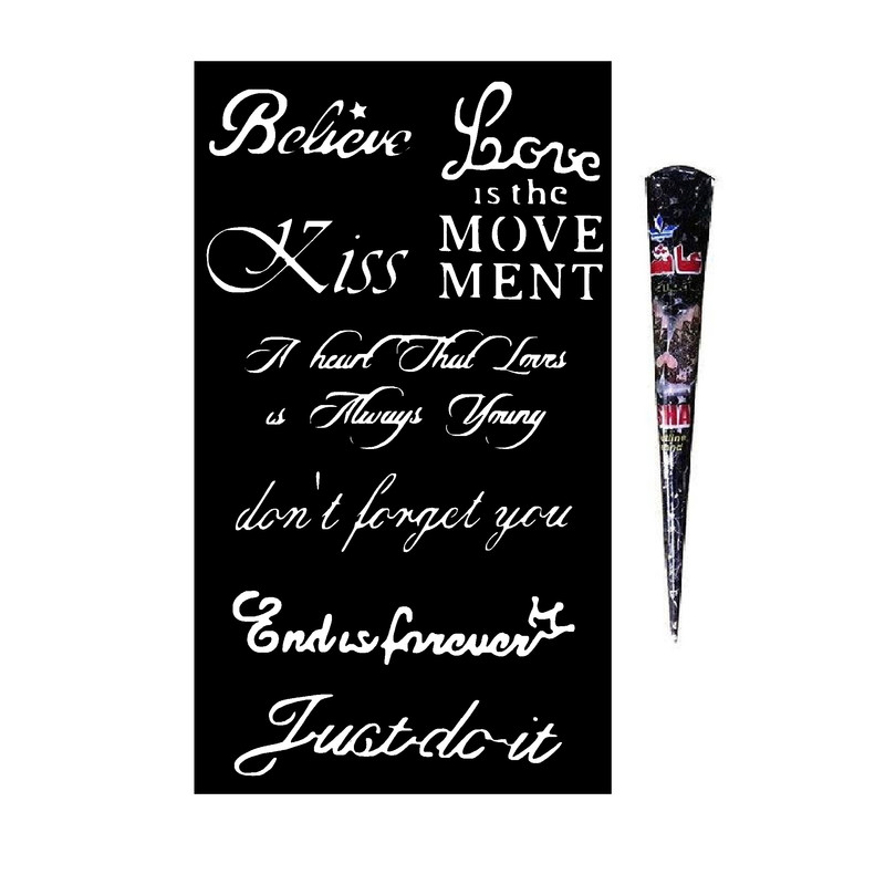 مجموعه حاضر شامل 7 طرح جداگانه تتو موقت متن انگلیسی و حنا طراحی آماده تتو بر روی بدن است. لازم به ذکر است شابلون های تتو موقت گلچین پرطرفدارترین متن های انگلیسی و از محصولات جدید تایلند است. برای استفاده محل مورد نظر را شیو کرده و یکی از طرح های شابلون را روی بدن بچسبانید و سپس با استفاده از حنا طراحی روی شابلون را آغشته به حنا کنید. پس از دقایقی -حدود 15 تا 20 دقیقه- که حنا کاملا بر روی پوست خشک شد شابلون را از روی پوست جدا کنید و پوست را با آب سرد بشویید. سایز برگه کامل تتوها 14x25 سانتی متر است.