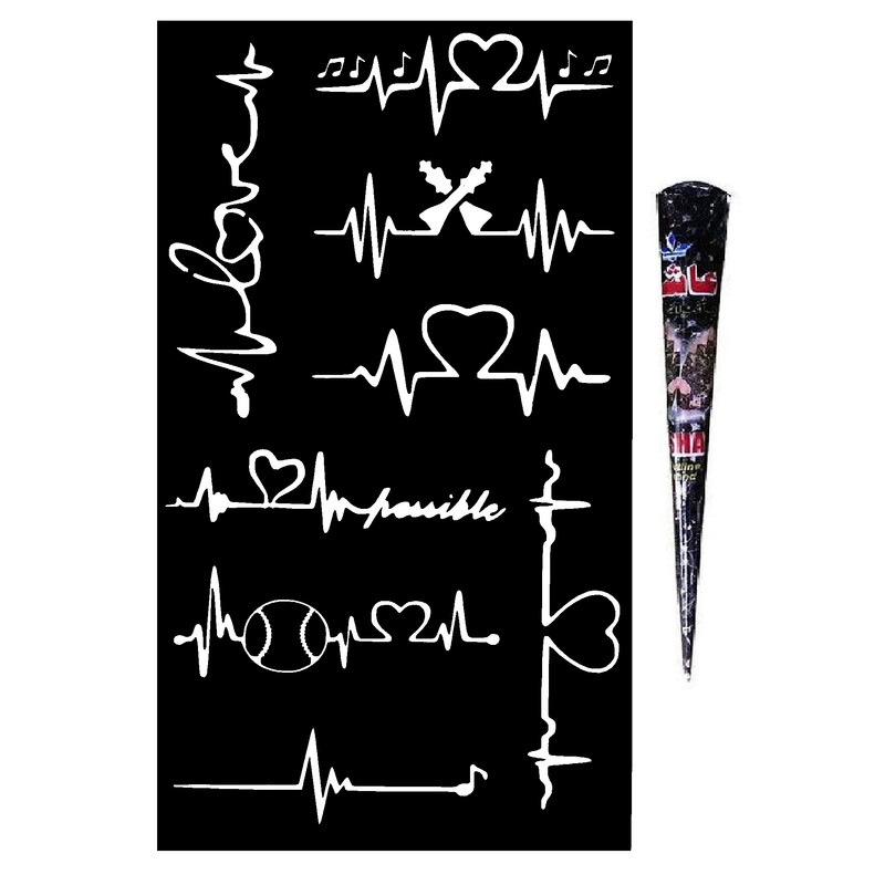 مجموعه حاضر شامل 8 طرح جداگانه تتو موقت ضربان و نوار قلب و حنا طراحی مناسب تتو بر روی بدن است. لازم به ذکر است شابلون های تتو موقت گلچین پرفروش ترین طرح ها از محصولات جدید و مرتبط با تتو تایلند است. برای استفاده محل مورد نظر را شیو کرده و یکی از طرح های شابلون را روی بدن بچسبانید و سپس با استفاده از حنا طراحی روی شابلون را آغشته به حنا کنید. پس از دقایقی -حدود 15 تا 20 دقیقه- که حنا کاملا بر روی پوست خشک شد شابلون را از روی پوست جدا کنید و پوست را با آب سرد بشویید. سایز برگه کامل تتوها 14x25 سانتی متر است.