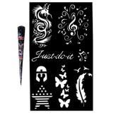 پک کامل تتو شامل 8 عدد شابلون تتو موقت از به روزترین طرح های دنیا و یک عدد حنا طراحی با کیفیت بالا که مقدار حنا برای تمامی شابلون ها کافی است. طرح ها به آسانی و به صورت جداگانه قابل اجرا بر روی نقاط دلخواه بدن است.