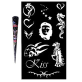 مجموعه شامل 11 عدد شابلون تتو موقت از به روزترین طرح های دنیا و یک عدد حنا طراحی با کیفیت بالا که مقدار حنا برای 10 عدد شابلون کافی است. طرح ها به آسانی و به صورت جداگانه قابل اجرا بر روی نقاط دلخواه بدن است.