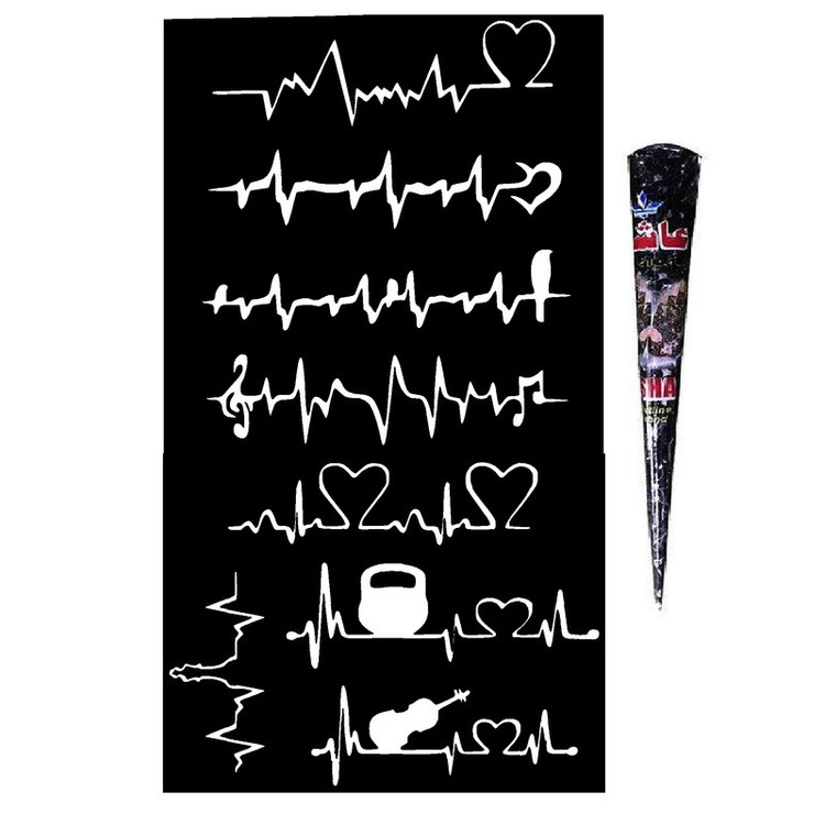 مجموعه حاضر شامل 8 طرح جداگانه تتو موقت ضربان و نوار قلب و حنا طراحی مناسب تتو بر روی بدن است. لازم به ذکر است شابلون های تتو موقت گلچین پرفروش ترین طرح ها از محصولات جدید و مرتبط با تتو تایلند است. برای استفاده محل مورد نظر را شیو کرده و یکی از طرح های شابلون را روی بدن بچسبانید و سپس با استفاده از حنا طراحی روی شابلون را آغشته به حنا کنید. پس از دقایقی -حدود 15 تا 20 دقیقه- که حنا کاملا بر روی پوست خشک شد شابلون را از روی پوست جدا کنید و پوست را با آب سرد بشویید. سایز برگه کامل تتوها 14x25 سانتی متر است.