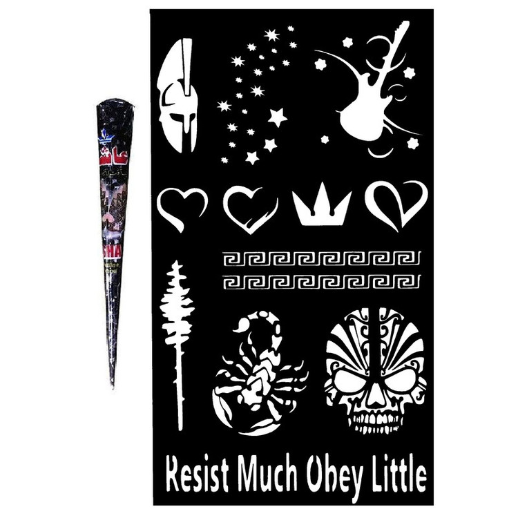 مجموعه شامل 13 عدد شابلون تتو موقت از به روزترین طرح های دنیا و یک عدد حنا طراحی با کیفیت بالا که مقدار حنا برای تمامی شابلون ها کافی است. طرح ها به آسانی و به صورت جداگانه قابل اجرا بر روی نقاط دلخواه بدن است.