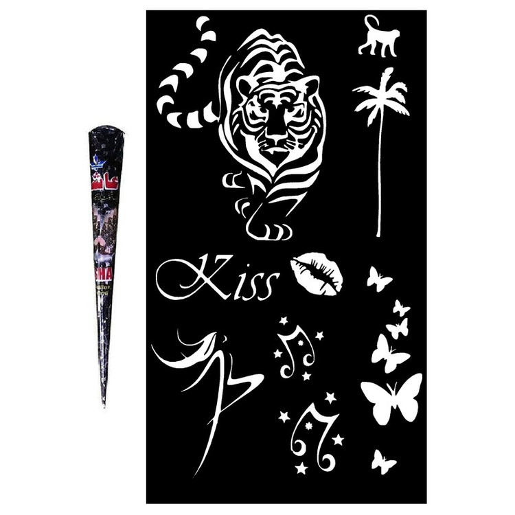 پک کامل تتو شامل 9 عدد شابلون تتو موقت از به روزترین طرح های دنیا و یک عدد حنا طراحی با کیفیت بالا که مقدار حنا برای تمامی شابلون ها کافی است. طرح ها به آسانی و به صورت جداگانه قابل اجرا بر روی نقاط دلخواه بدن است.