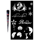 پک کامل تتو شامل 9 عدد شابلون تتو موقت از به روزترین طرح های دنیا و یک عدد حنا طراحی با کیفیت بالا که مقدار حنا برای تمامی شابلون ها کافی است. طرح ها به آسانی و به صورت جداگانه قابل اجرا بر روی نقاط دلخواه بدن است.